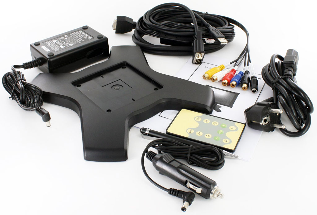 AC-Adapter for home usage and a car cigarette lighter adapter is included as well as the IR-remote-control unit and the extra long (2,5 meters) All-In-One connector cable.